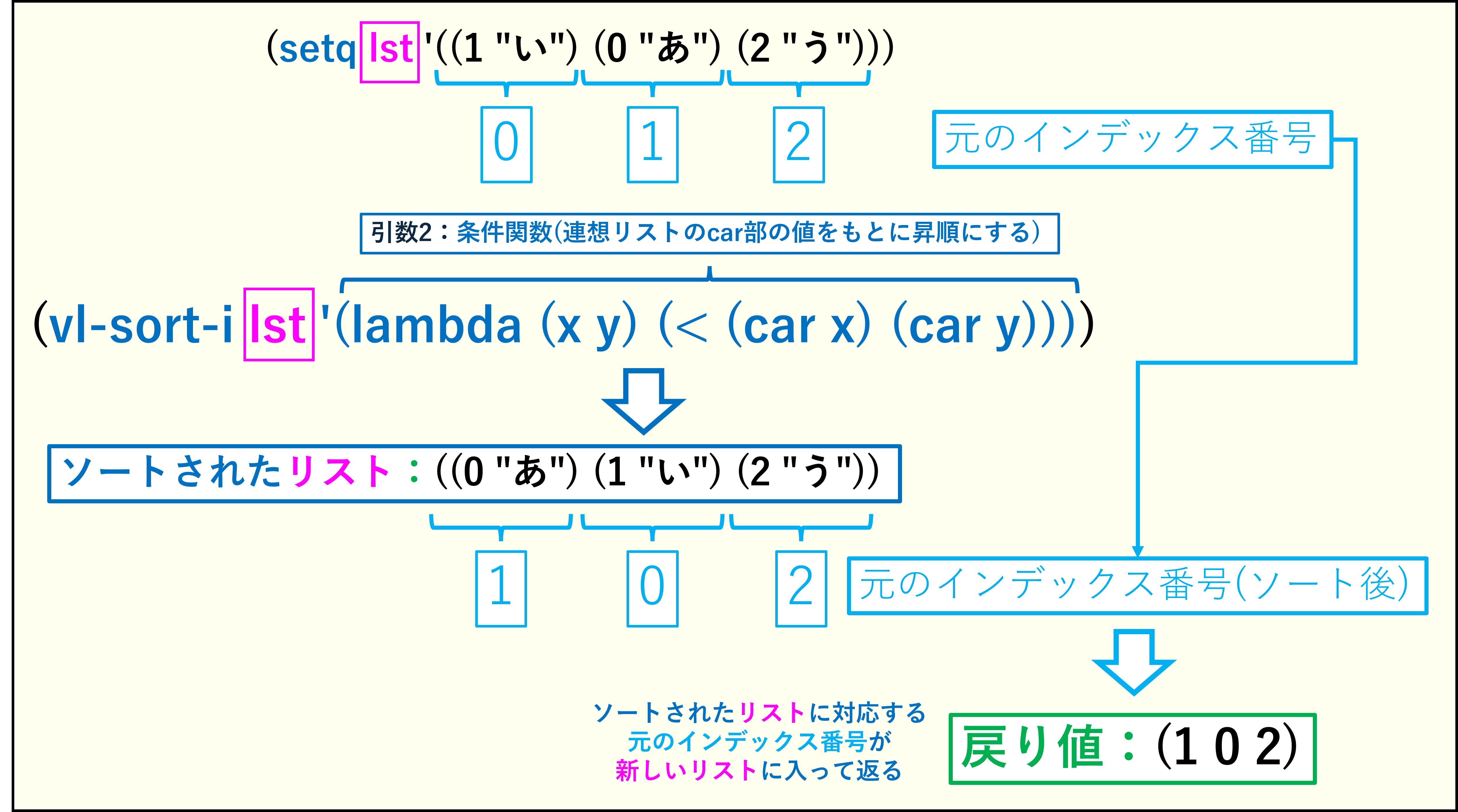 ややこしいですが、戻り値の値は元のリストのインデックス番号です。元の要素にインデックス番号の値がはりついて、同時にソートされるのを想像してください。こちらはvl-sort関数とは違って、値が重複してもまとめられることはありません。