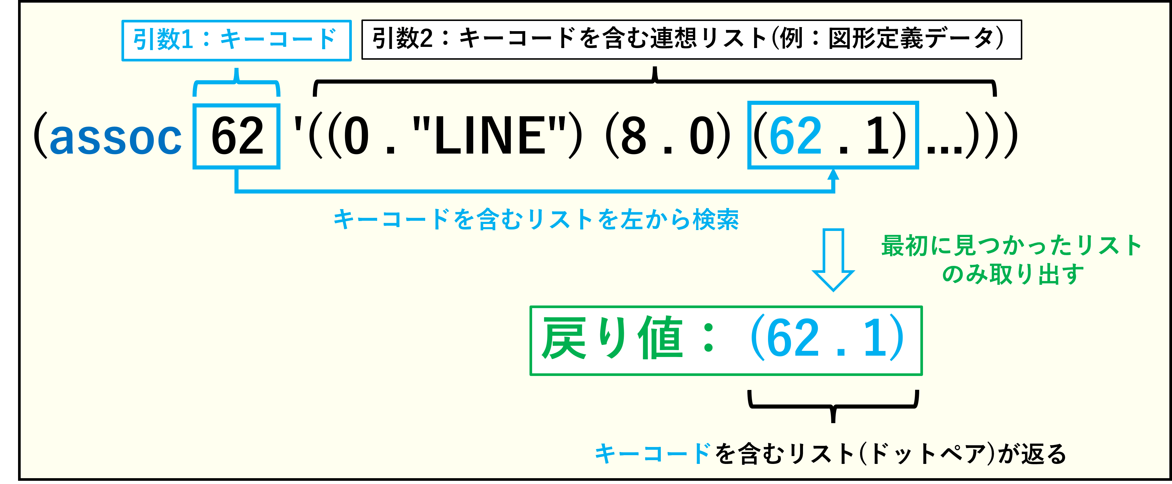 (assoc キー 連想リスト) |
