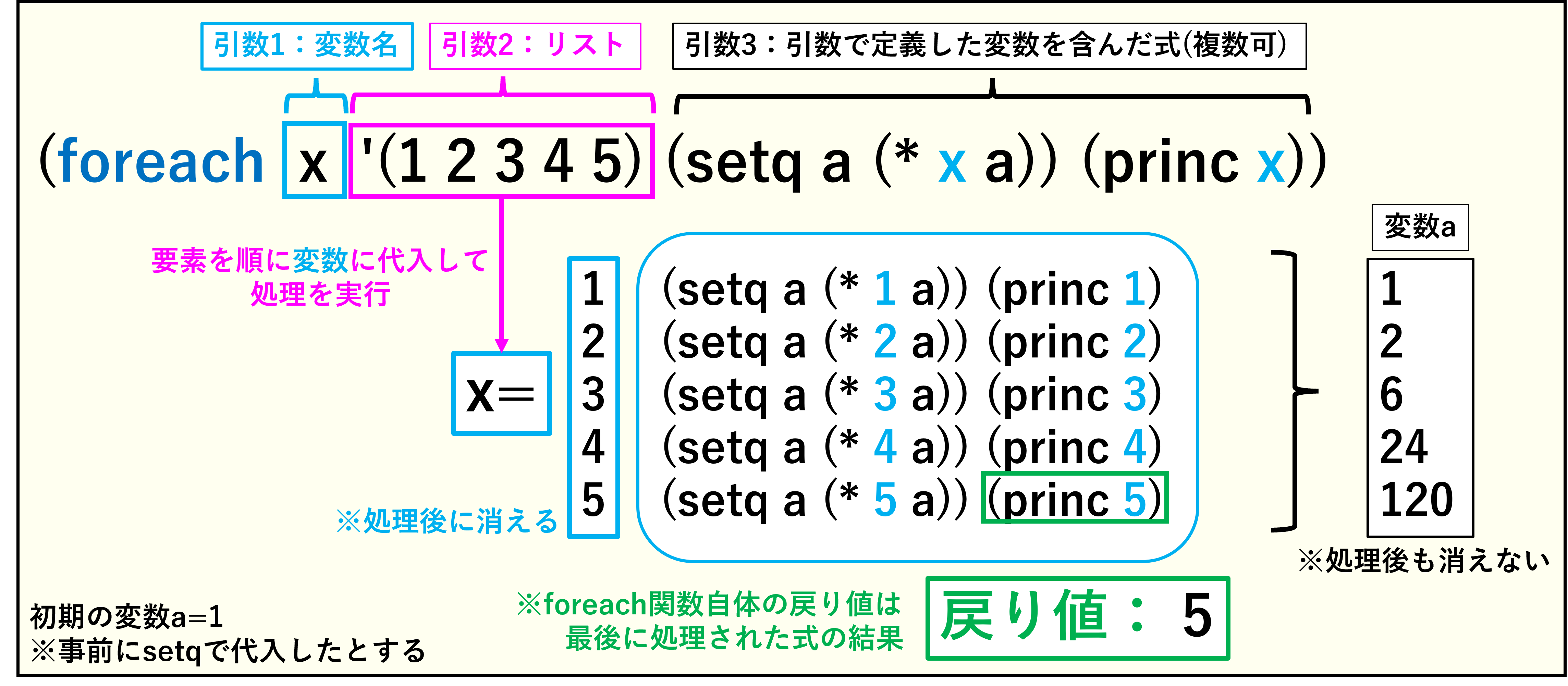 構文は、これまでの関数と比べて少しだけ複雑で、(foreach 変数名 リスト 変数名を含んだ式)と言った感じです。