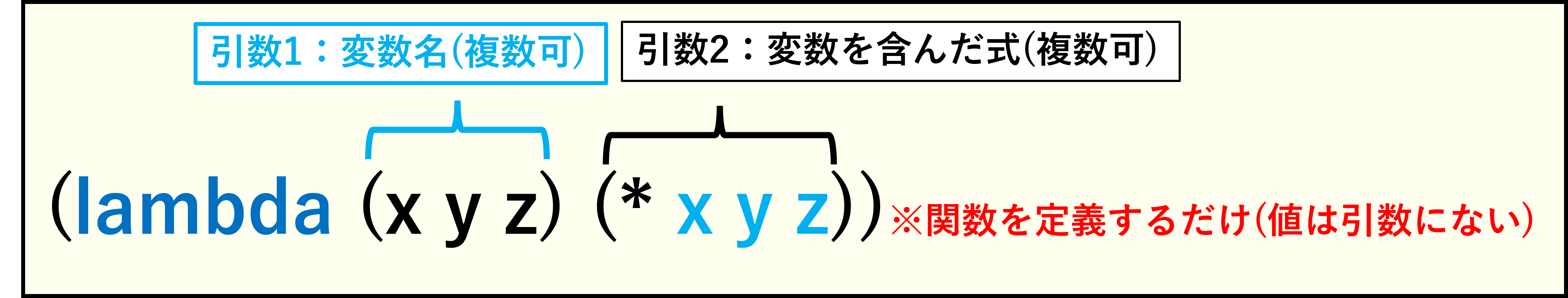 defun関数と違い、lambda関数が定義するのはあくまで「変数」と「処理」です。具体的な値は引数にはありませんし、名前も持たないので呼び出すことはできません。