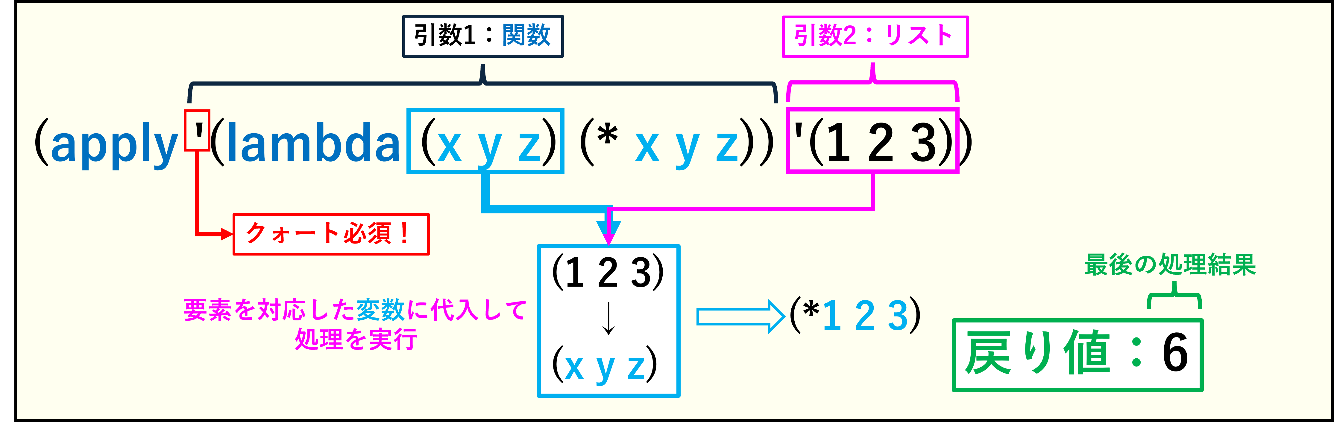 apply関数は、lambda関数が定義した変数と対応するリストを1つ渡し、それらを当てはめて処理を行います。戻り値はその処理によって異なります。