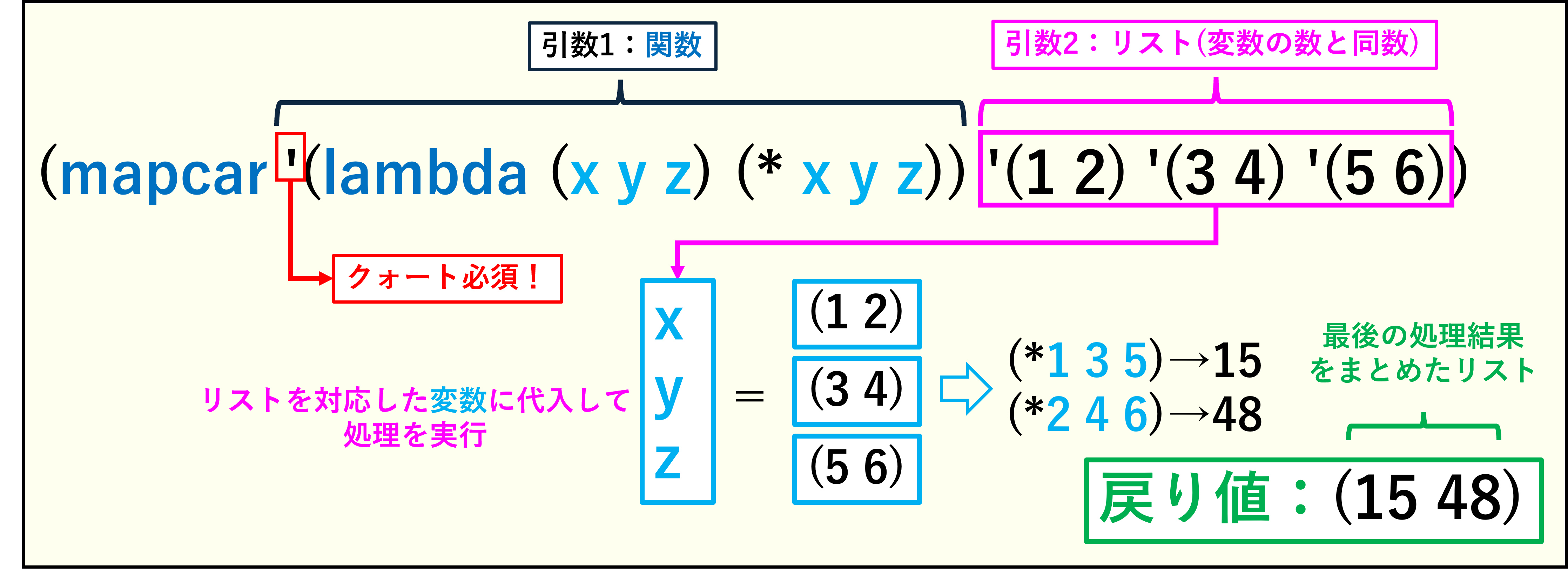mapcar関数は、lambda関数が定義した変数と対応する複数のリストを渡し、それらを当てはめて処理を行います。戻り値は結果が入ったリストです。