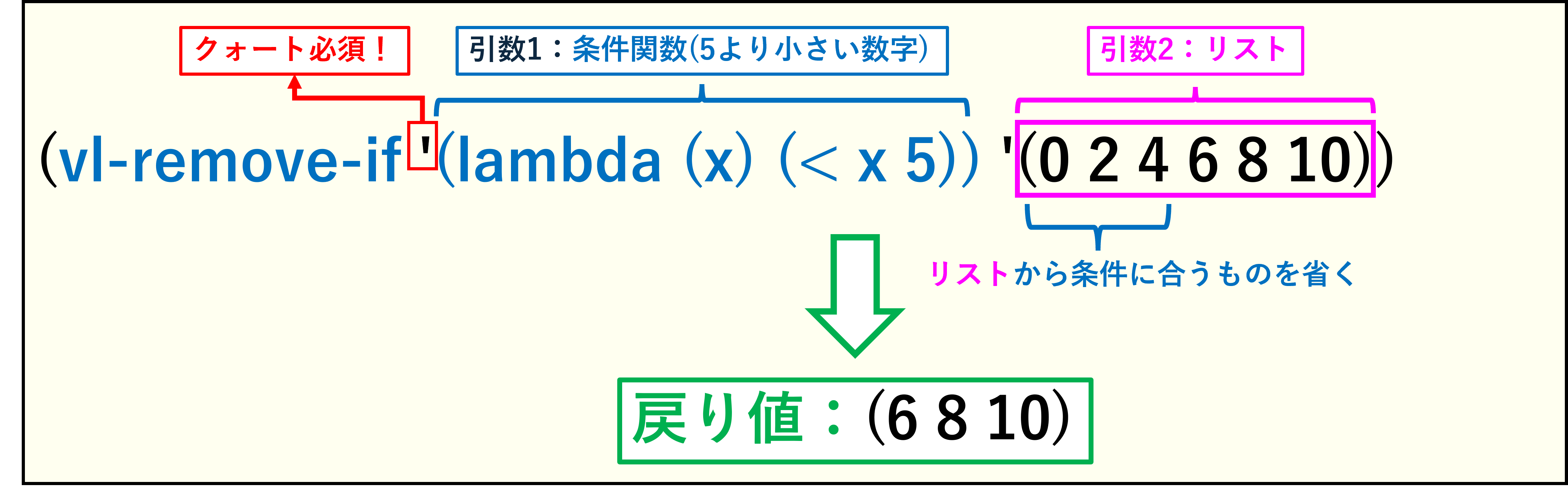 (vl-remove-if ’条件関数 リスト) |