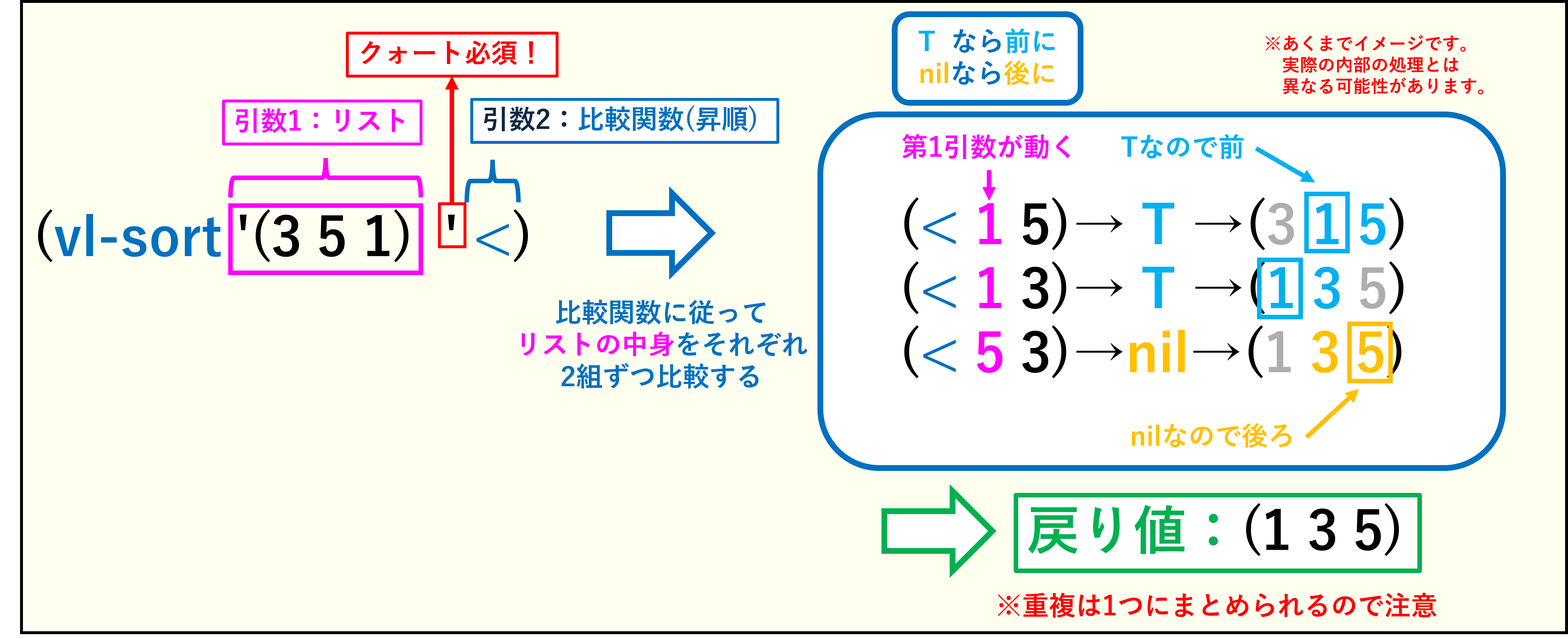 リスト内の要素をそれぞれ2組ずつ比較して、結果を元に並び替えます。比較関数の結果がTの際に、比較関数に渡された第1引数が前(リストの左側)になるので、「<」は昇順、「>」は降順です。