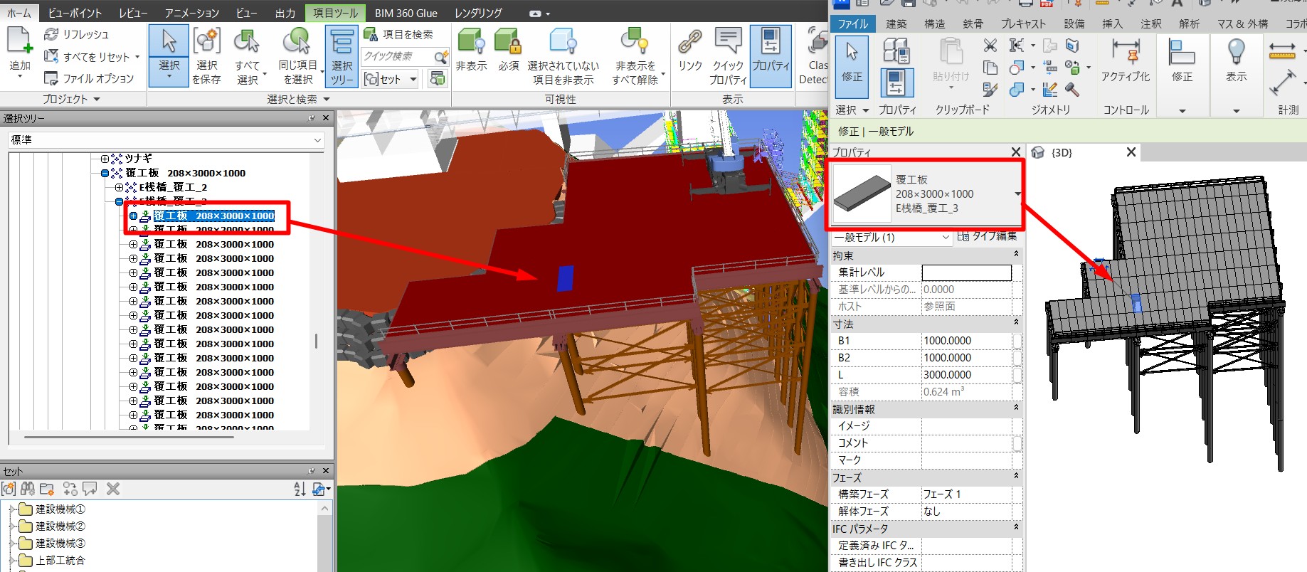 Navisには色々な形式のデータを読み込めます。そして各データのプロパティ情報も確認できます。例えば、下図の桟橋はRevitで作成しました。桟橋の覆工板のモデル名が、Navisでも確認できます。