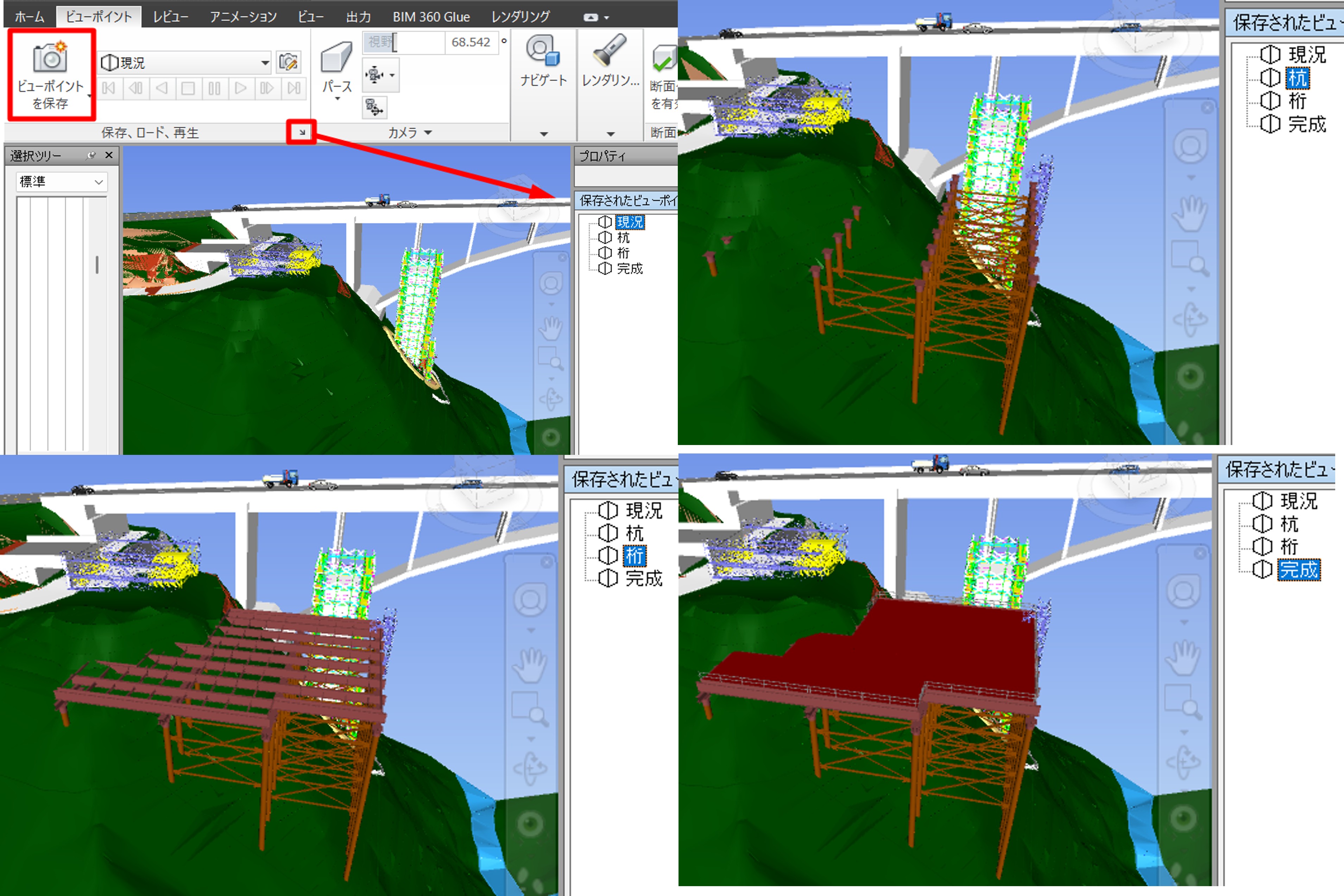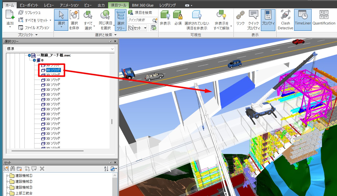 Navisはデータ統合用のソフトで、モデルの作成や編集はできません。影や質感などのリアルな描写もできませんが、その代わり動作がとても軽いです。上図は橋梁の施工状況を再現したもので、構造物や地形などのモデルを読み込んで統合させています。左側の「選択ツリー」で選択した重機が、中心に写っている青色の重機です。基本はモデルを読み込んで視点を変えたり、モデルの表示を切り替えたり、距離を測ったりできて、他にもビューの保存やアニメーションも作成できます。