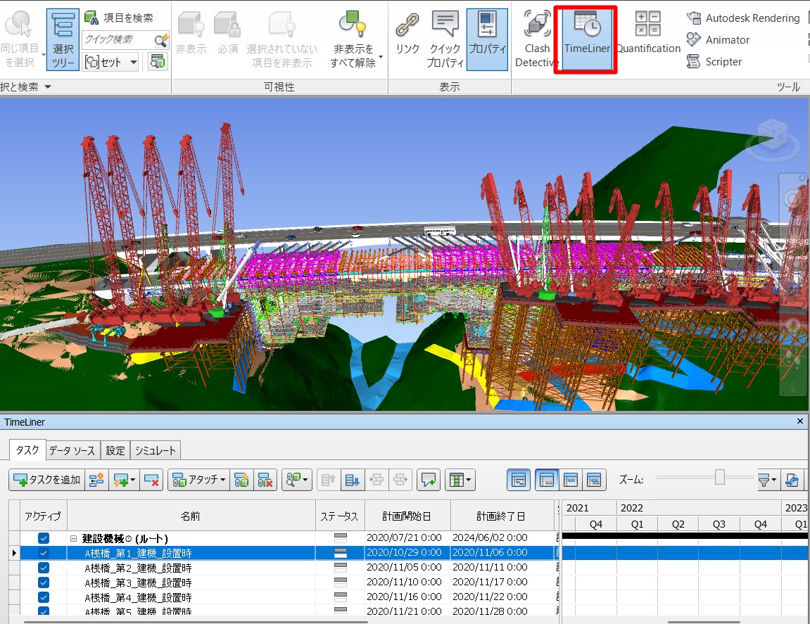 先ほどのビューポイントでも施工ステップは作成できますが、TimeLinerという機能を使えばもっと良い動画を作成できます。下図はステップに必要なモデルを全部表示させた状態です。ごちゃごちゃしていますが、場所ごとのクレーンや、掘削する前と後の地形など、全部必要な物です。これら1つ1つに「表示/非表示」と「時間」を設定すれば動画になります。