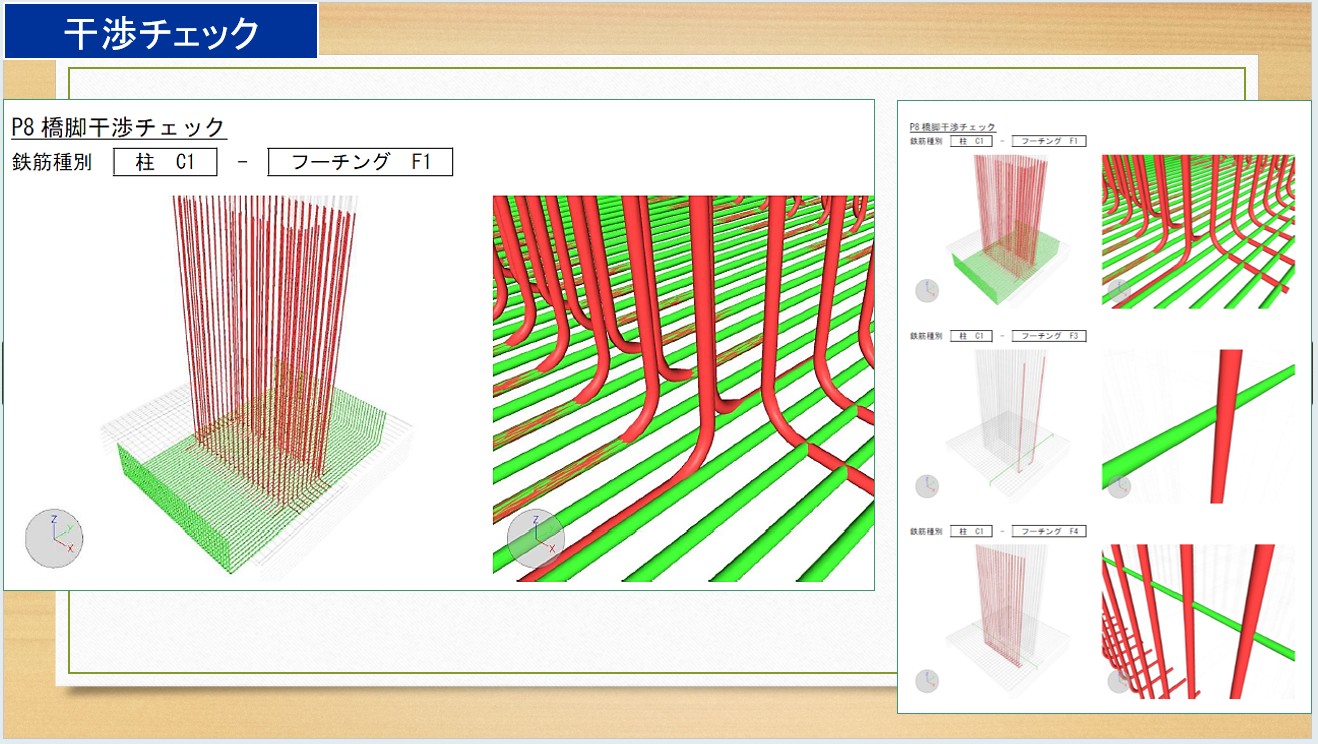 Navisではモデル同士の干渉を調べられます。例として、鉄筋の干渉チェックを見てみましょう。下図は橋脚の鉄筋モデルで、ソフトで干渉チェックをかけた結果、柱とフーチングの鉄筋が干渉していることがわかりました。干渉している鉄筋が赤と緑で表示され、その結果はビューポイントで保存可能です。鉄筋は図面通りにモデルを作っても非常に多くの干渉が検出され、大きく複雑な物なら何百もの干渉結果が出てきます。干渉箇所を3Dで視点を変えながら「どの鉄筋が」「どれぐらい干渉している」のかを確認できるのはとても便利です。
