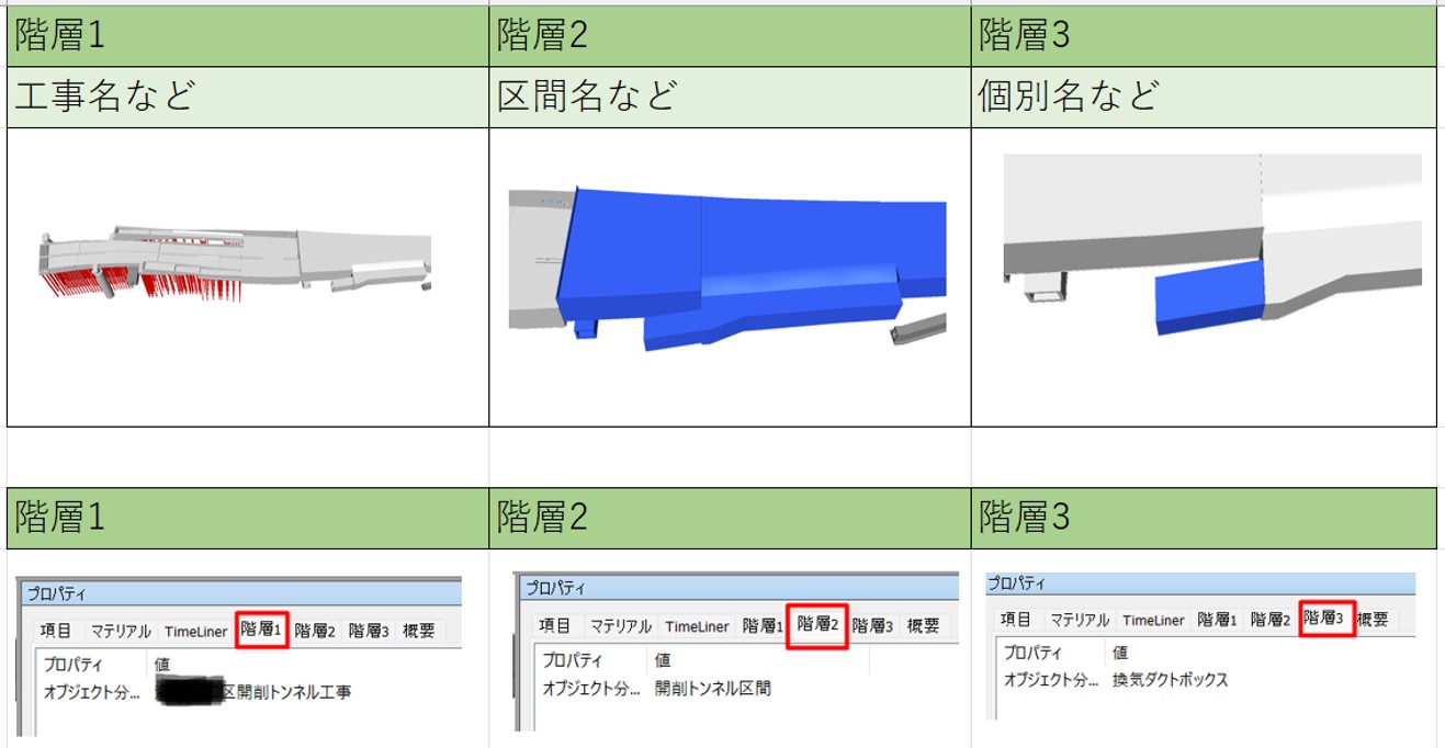 BIM/CIMデータを国交省に提出する際、属性情報の付与が必要です。基本は階層1,2,3があり、モデルを選択すると「どの工事の」「どこの」「どんな物」かを画面上で確認できるように設定します。(材料や寸法など細かく記載する場合もあります)