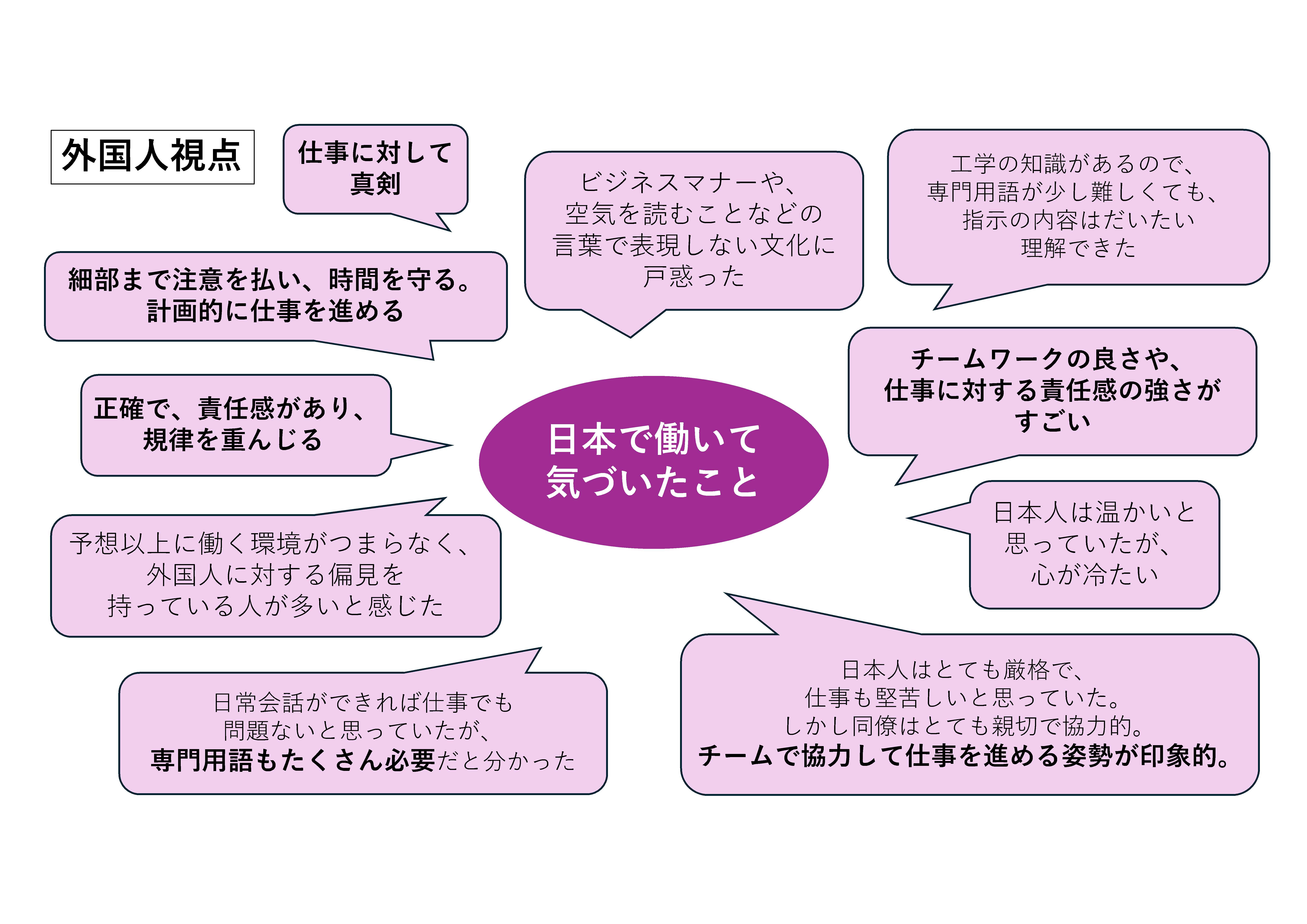 自国で日本語や日本人について勉強してから来日したものの、実際に日本の会社で働くとたくさんの気づきや誤算があったようです。