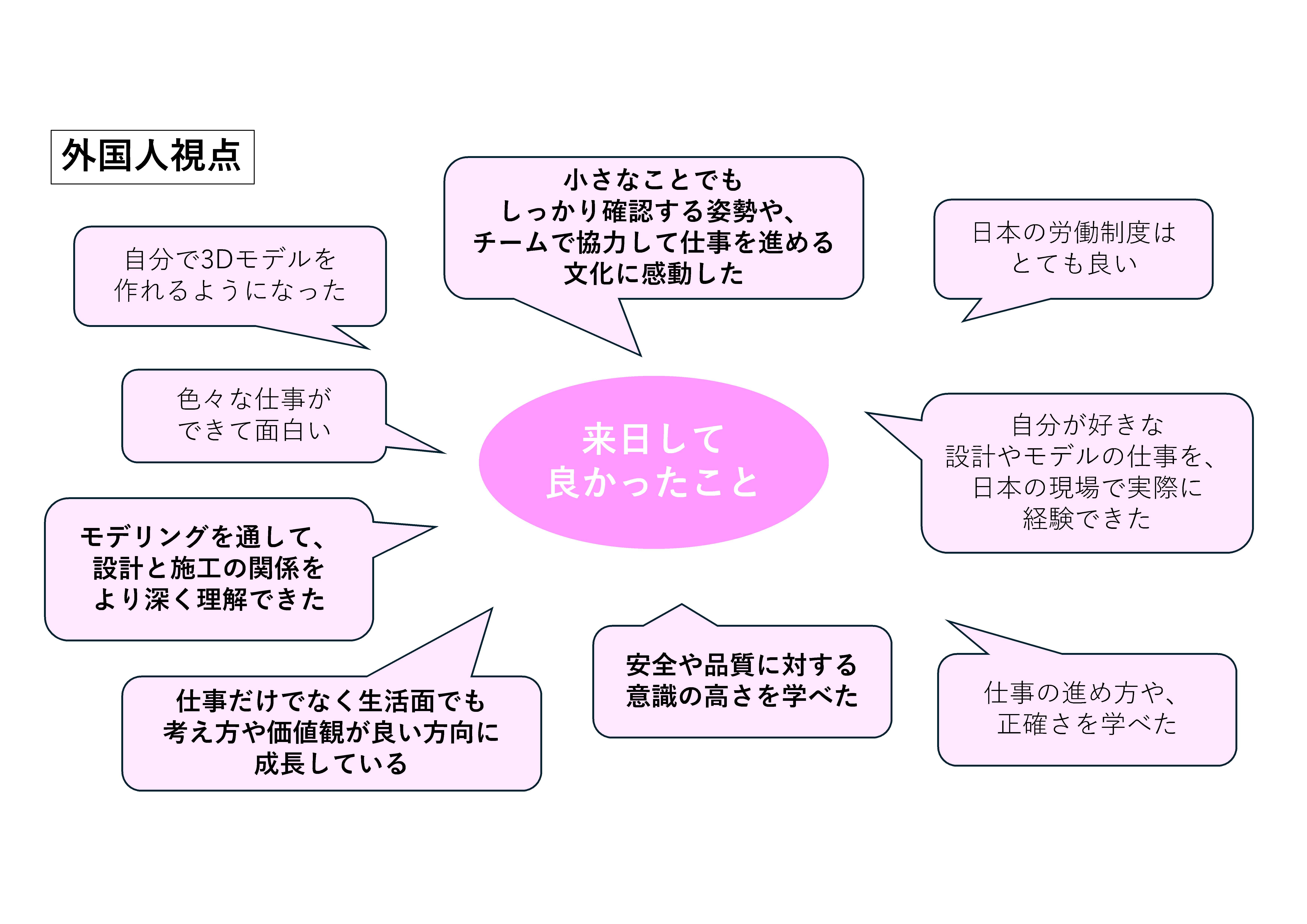 日本で働くと自国との考え方の違いに戸惑うそうですが、皆日本人の真面目さに感心しています。細かい所まで気を配り、相手(客先)のことを考えて行動する。